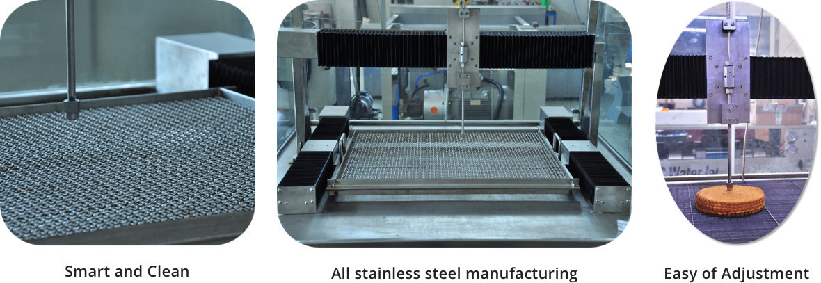 A qualidade do corte depende do tipo, temperatura e velocidade de corte do produto.A velocidade média de corte é de cerca de 3-5m/min, ao cortar mousse ou biscoitos, a velocidade pode chegar a 10m/min. A maior vantagem do corte com jato de água é a economia de tempo usando água pura como solução de corte de alimentos.Como nenhuma lâmina de faca é usada, não há tempo de inatividade para trocar ou afiar lâminas cegas.